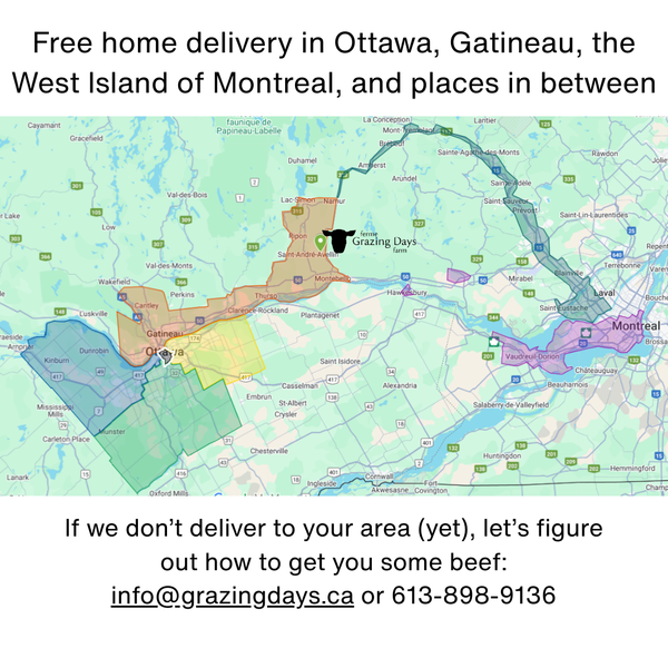 Bring home delicious beef raised the way nature intended. Our cattle are 100% grass-fed and grass-finished, raised on our lush pastures in St-André-Avellin, Quebec. They’re moved to fresh grass multiple times a day during grazing season and enjoy dried grass (hay) in the winter. No grains, no antibiotics, no growth hormones — just healthy, well-raised animals that produce beef you can feel good about feeding your family.